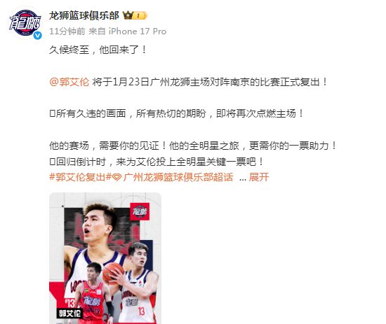 如今广州男篮官方宣布:“久候终至,他回来了!郭艾伦将于1月23日广州男篮主场对阵同曦男篮的比赛正式复出!所有久违的画面,所有热切的期盼,即将再次点燃主场!”