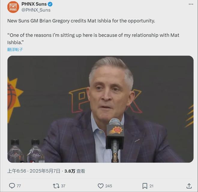 2023年2月伊什比亚成为太阳老板,2024年夏天他把格雷戈里挖过来担任运营副总裁。格雷戈里一直混迹于NCAA,他在NBA几乎没有人脉。格雷戈里在太阳只待了一年,老板就把他扶正、挤走了詹姆斯-琼斯。哪里都有人情世故……