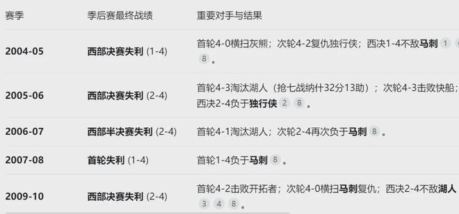 纳什在太阳两次拿到MVP,8次入选全明星,7次入选年度最佳阵容,5次拿到常规赛助攻王,4次达成“180俱乐部”。纳什在太阳最大的遗憾就是没能拿到总冠军,甚至没进过总决赛。纳什率队两次打进西决,一次1比4,两次2比4。