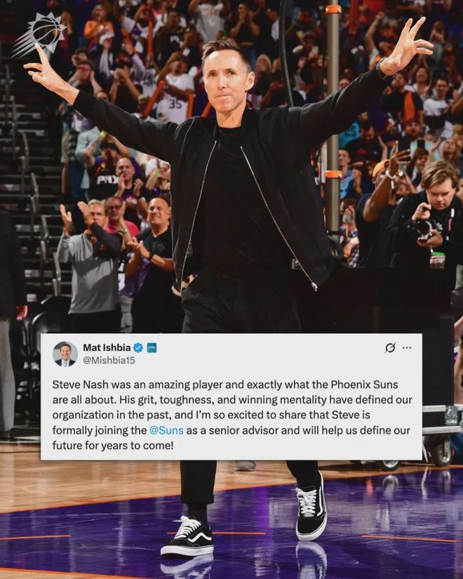 太阳老板马特-伊什比亚宣布,史蒂夫-纳什重返太阳,担任球队高级顾问。按理说这个消息应该是太阳官方来发布,没想到太阳老板直接就宣布了。太阳老板此举是为了安抚球迷,最近两年糟