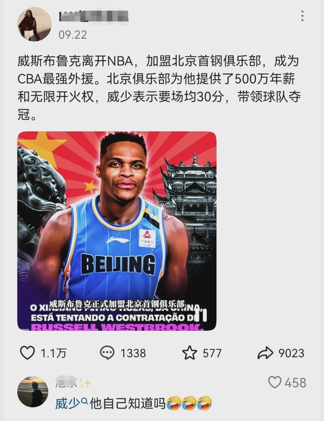 突然间刷到了很多“威少加盟北京队”的视频......但翻烂了各大正经的新闻平台,都没有任何关于威少加盟北京队的报道,当然不排除是有人在威少或北京队GM张云松床底下偷听到的,要