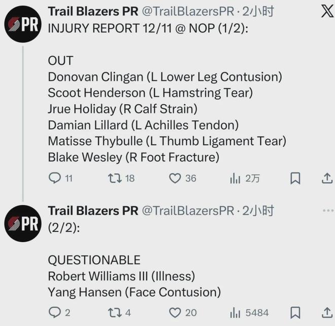 最近似乎是流感比较严重,各位篮友保重好身体,穿够衣服,做好防护。在大洋彼岸的美国,也有类似的情况,仅就开拓者队内都有不少球员出现生病的情况,导致非战斗减员。这些倒下的开拓者