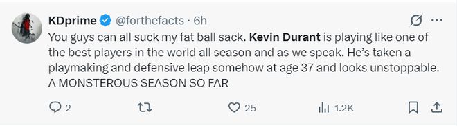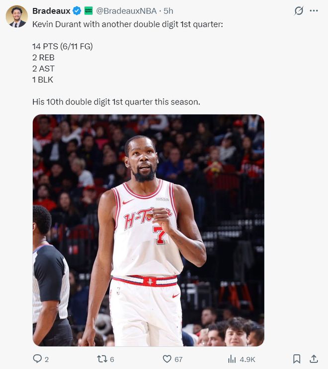 杜兰特球迷组织:杜兰特整个赛季的表现堪称世界最顶级,这场比赛也如此。他以 37 岁的高龄在传球能力和防守能力上都有提升,本赛季看起来势不可挡。迄今为止,他打出了一个极其出色的赛季。