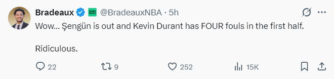 火箭记者Bradeaux写道:开场我们就折损了申京,而杜兰特半场就吃下4个犯规,太荒谬了。