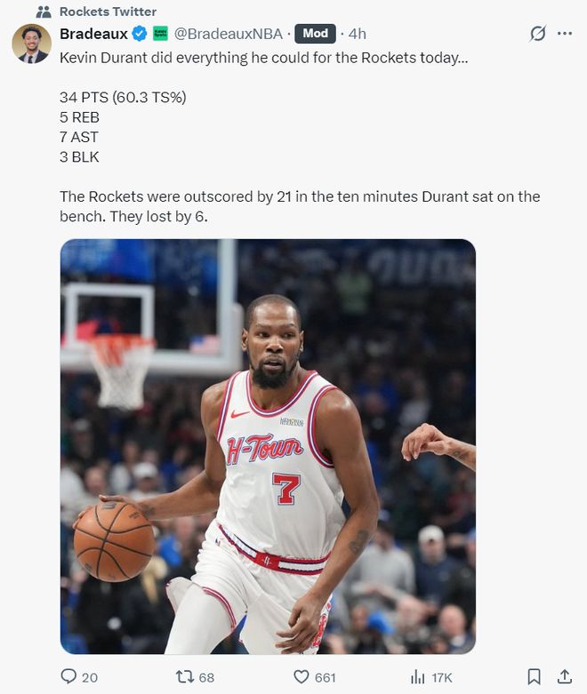 火箭记者:杜兰特下场的几分钟独行侠净胜火箭21分之多,最终火箭只输了6分。