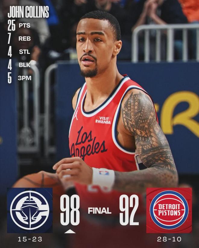 北京时间1月11日,NBA常规赛:快船客场98-92逆转活塞,本赛季双杀东部第一。快船内线科林斯表现出色,投篮14中9,三分8中5,罚球4中2,砍下25分7篮板1助攻4抢断4盖帽,正负值+19全场最高。