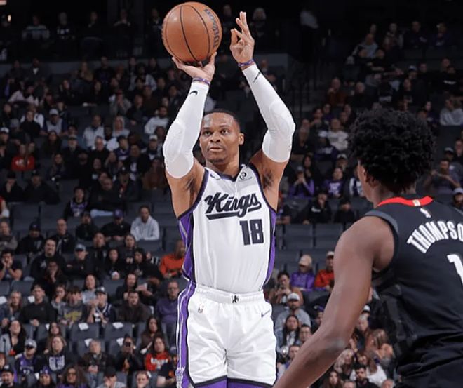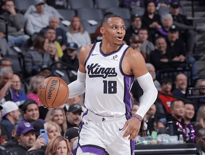 国王队这边,德罗赞出战18分钟,投篮6中6、罚球1中1得到13分2助攻,常规赛生涯总得分突破26000里程碑大关,NBA历史第23人,现役第六人,仅次于詹姆斯、杜兰特、哈登、威少、库里;威少出战12分钟,投篮5中1、三分4中1得到3分5篮板5助攻3失误。
