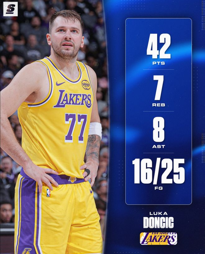 美媒:东契奇是湖人队史第一位单场至少42+8+7+4抢断的数据。