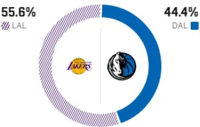反观独行侠近期状态回升,斩获四连胜的同时,过去六场比赛赢下五场,目前以19胜26负排在西部第十一位,本赛季整体表现不及预期。欧文长期缺阵让球队进攻端承压,新科状元弗兰格承受巨大的带队压力;湖人内线核心浓眉则受困伤病打打停停,频繁卷入交易流言,成为交易截止日前的焦点。不过,弗拉格近期表现渐佳,攻防两端持续进步,展现出不俗天赋。此役,浓眉、莱弗利将继续缺战,独行侠内线加福德出战,有望弥补部分防守空缺。不过,美媒ESPN认为独行侠整体实力偏弱,加上浓眉缺阵,湖人拿到胜利的概率来到55.6%,独行侠取胜的概率为44.4%。