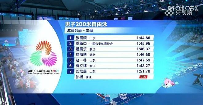 全运会男子200米自由泳:张展硕夺冠,潘展乐第三、孙杨犯规