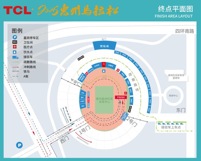 1.在规定时间内完赛的参赛选手按照指引牌要求前往完赛物品发放区。凭号码布领取完赛纪念奖牌和完赛包,如遇领取人数较多,请有序排队。