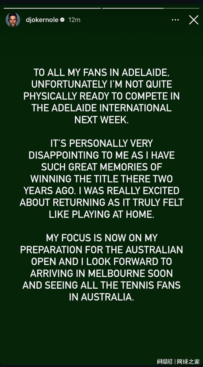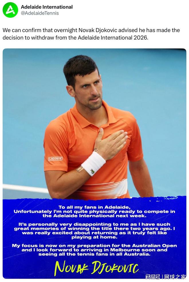 “很遗憾,我的身体状态尚未准备好参加下周的阿德莱德国际赛。 这对我个人而言非常令人失望,因为我对两年前在那里夺冠的经历仍记忆犹新。我原本对重返赛场满怀期待,那里于我而言就像主场一样。 如今我的重心已放在澳网的备战上,我期待很快抵达墨尔本,与澳大利亚所有的网球迷相见。”德约科维奇在声明中坦率地表达了身体状态未达最佳的事实。
