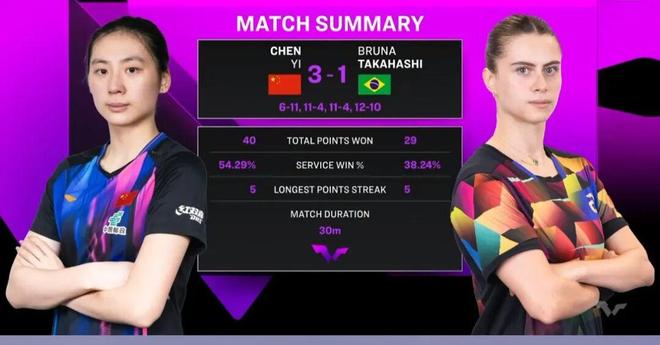 陈熠面对巴西选手高桥·布鲁娜,上次双方交手时打得非常胶着,直到决胜局才分出胜负。这次双方再度交战,类似的剧本在第四局上演。陈熠在大比分2-1领先的情况下,第四局状态出现波动。奋起直追后,双方来到10-10,陈熠叫停比赛,暂停回来后果断拿下关键分,3-1(6-11,11-4,11-4,12-10)战胜对手,晋级次轮。
