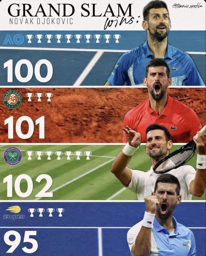 至此,德约科维奇已经解锁澳网100胜、温网102胜、法网101胜,成为男子网坛唯一一位在三个不同大满贯都实现“百胜成就”的球员。在美网,小德的胜绩是95胜,离破百也已经不算太远。