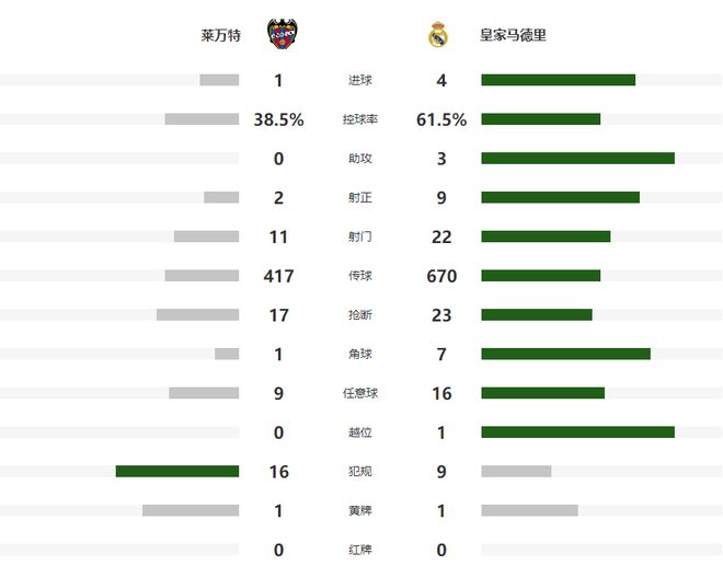 不过皇马在第64分钟稳住阵脚,姆巴佩反击中杀入莱万特禁区,造成防守球员铲球犯规,为球队赢得一粒点球,随后姆巴佩亲自操刀,用一记勺子点球,帮助皇马把领先的优势扩大到了3-1,仅仅过了2分钟皇马就终结了胜负的悬念,居勒尔中场挑传,姆巴佩单刀破门,靠着3分钟2球的神勇发挥,超越齐达内成为了皇马队史进球第二多的法国球员,帮助银河战舰将比分定格为了4-1。