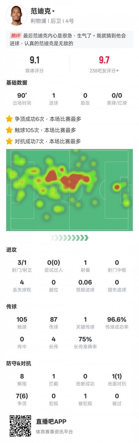 范迪克本场数据:1进球8解围7次对抗成功,评分9.1