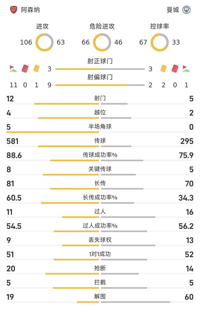 雷速体育9月22日讯 英超第5轮,曼城客场1比1战平阿森纳,曼城本场控球率仅32.8%。