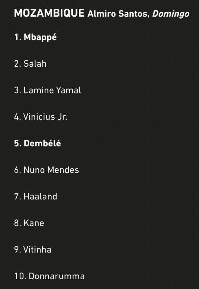 姆总第一顺位,莫桑比克记者投票:维尼修斯第四,登贝莱第五