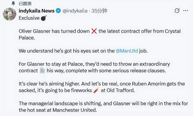 2025-26赛季英超,水晶宫是唯一保持不败的球队,6战3胜3平积12分,排在第3位。水晶宫主帅格拉斯纳,展现出优秀的执教能力。10月2日,著名资讯账号indy kaila(球迷称呼为绿帽哥)独家爆料,格拉斯纳拒绝水晶宫的续约合同,他在等待曼联的召唤。
