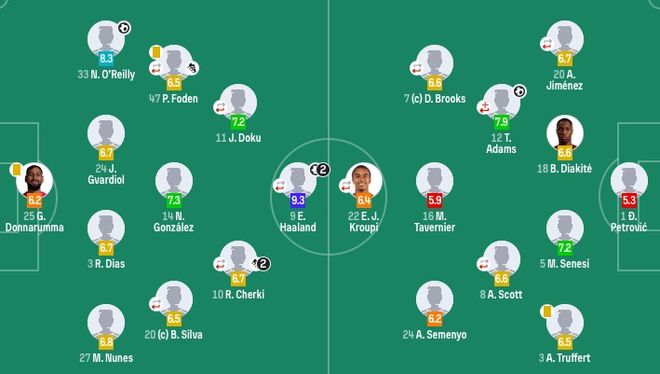 曼城首发:25-多纳鲁马、27-努内斯、3-迪亚斯、24-格瓦迪奥尔、33-奥赖利、14-尼科、20-B席(90'21-努里)、47-福登(90'16-罗德里)、10-谢尔基(73'4-赖因德斯)、11-多库(73'26-萨维尼奥)、9-哈兰德(82'7-马尔穆什)