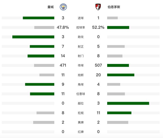 在北京时间11月3日凌晨结束的英超第10轮一场焦点战中,曼城在主场3-1完胜伯恩茅斯。上半场,哈兰德双响,谢尔基2助,泰勒-亚当斯破门。下半场,奥莱利为曼城锁定胜局。曼城也送给了伯
