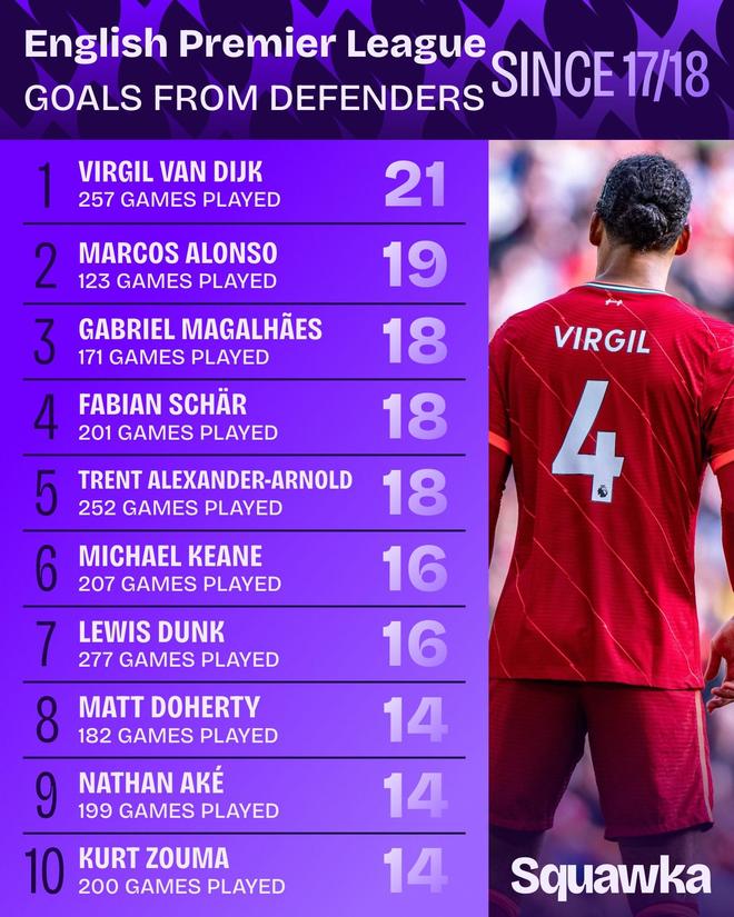 - 北京时间11月19日,知名数据机构Squawka统计了自2017-18赛季以来英超联赛的后卫进球榜,范戴克21球排名第一,马科...发表于: 11-19 14:33