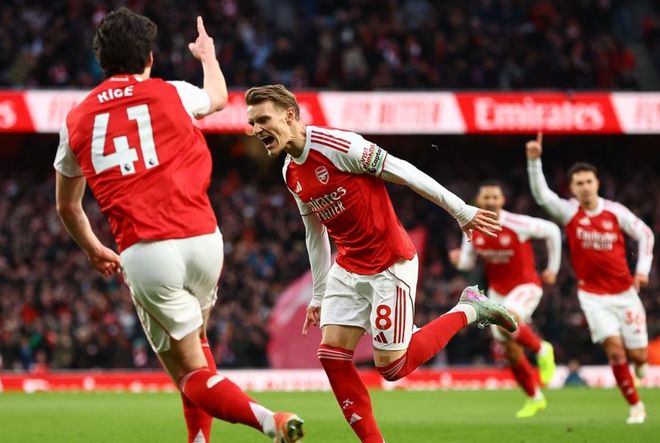 比赛刚开始不久,哲凯赖什获得非常好的机会,他在禁区前沿的一脚凌空射门没有打上力量。门将倒地把球扑住。随后,萨卡突入禁区右侧,小角度射门,被挡了出去。第14分钟,阿森纳进球了!厄德高在禁区前沿起脚远射,皮球钻入球门近角!这是厄德高本赛季的首粒进球!