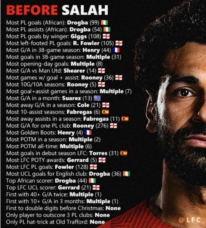 - 最近@LFC_发布了《萨拉赫之前/之后》英超纪录对比榜单,我一眼扫过去就乐了:上半张是德罗巴、亨利、鲁尼这些老...发表于: 12-29 08:43