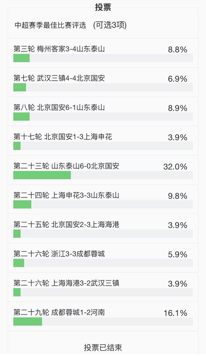 2025中超最佳比赛正式出炉!赛季第23轮,山东泰山在济南奥体中心6-0复仇北京国安的比赛以32.0%的得票率成功当选。