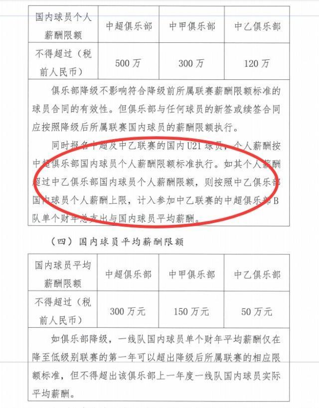 “同时报名中超及中乙联赛的国内U21球员,个人薪酬按中超俱乐部国内球员个人薪酬限额标准执行。如其个人薪酬超过中乙俱乐部国内球员个人薪酬限额,则按照中乙俱乐部国内球员个人薪酬上限,计入参加中乙联赛的中超俱乐部B队单个财年总支出与国内球员平均薪酬。”