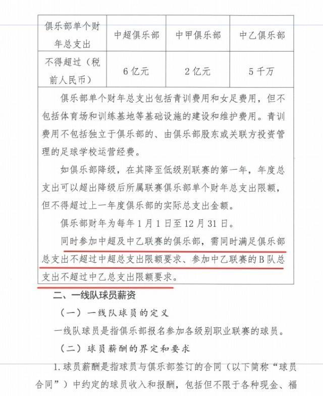 3、同时参加中超及中乙联赛的俱乐部,需同时满足俱乐部总支出不超过中超总支出限额要求、参加中乙联赛的B队总支出不超过中乙总支出限额要求。